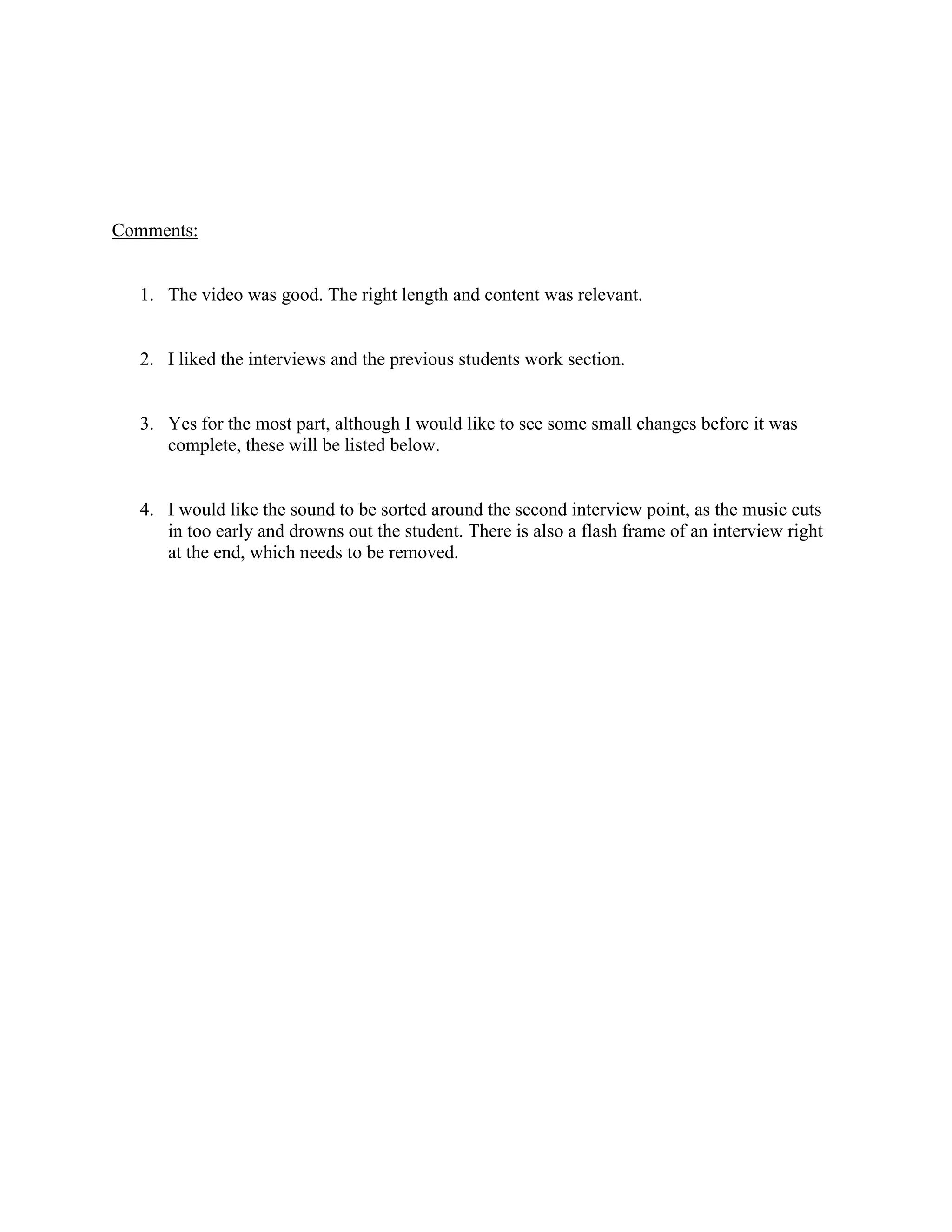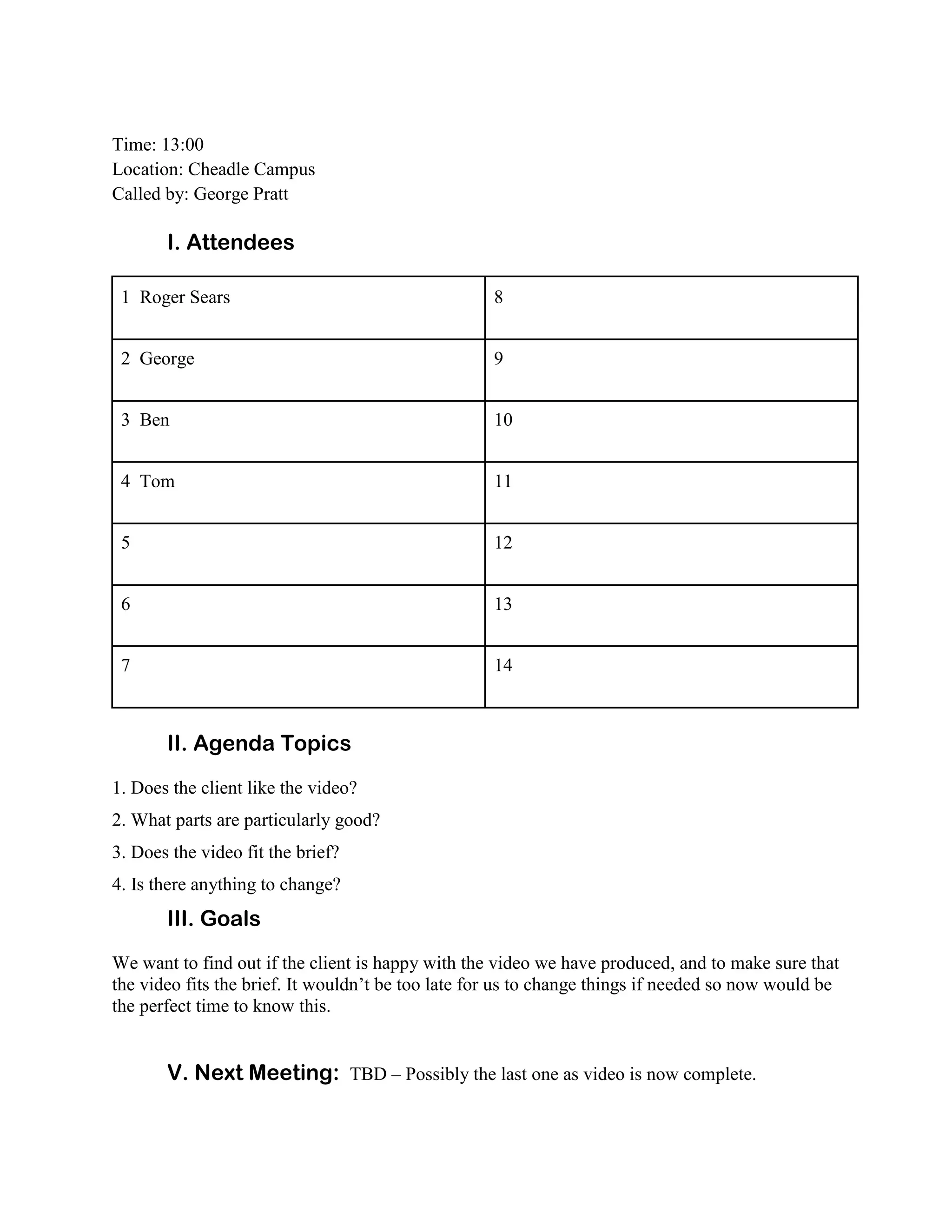 The meeting took place on 13:00 at the Cheadle Campus to discuss a promotional video produced for a client. There were 7 attendees. The agenda covered whether the client liked the video, good parts of the video, if it fit the brief, and changes needed. The goal was to get feedback and make improvements if needed. The client provided positive feedback but noted issues with sound overlapping speech in one interview and a flash frame at the end that needed removing. The producer agreed with the needed changes and planned to address them before completing the video.