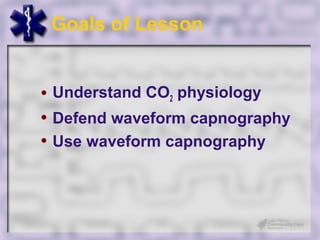 This document provides an overview of capnography and carbon dioxide physiology. It discusses how capnography can be used to ensure proper endotracheal tube placement and monitor ventilation during CPR or respiratory issues. The document outlines carbon dioxide transport in the body and how the capnography waveform can be analyzed to detect abnormalities. In summary, capnography is a vital tool for airway management and ventilation monitoring that provides important real-time patient information.