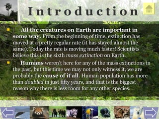 The document details a 7th-grade science project focused on the current endangered animal crisis, emphasizing the rapid extinction rates caused primarily by human activities. Students are tasked with researching a specific endangered species, creating a branching diagram, and presenting their findings through a written essay and visual display. The conclusion highlights the importance of all species for human survival and encourages students to share their knowledge and take action.