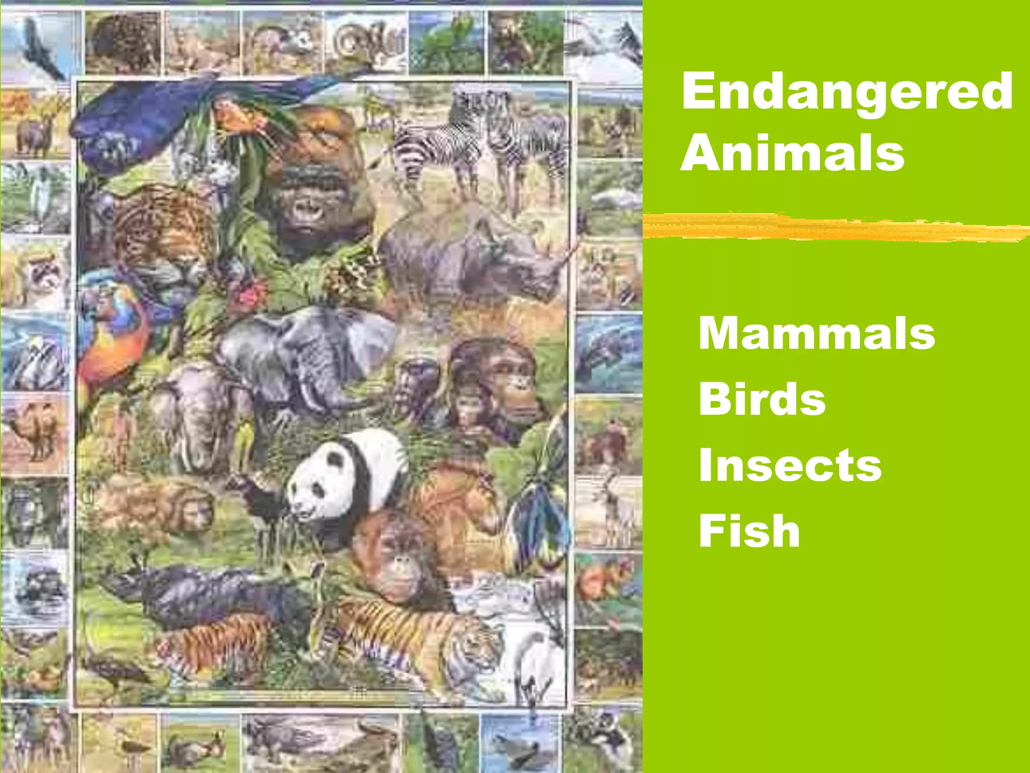 This document provides information on various endangered species of mammals, birds, reptiles, fish and insects. It describes the physical characteristics and classification of endangered Asian elephants, blue whales, hybrid spider monkeys, Asiatic cheetahs, tigers, giant pandas, black rhinoceros, Marquesan kingfishers, California condors, whooping cranes, hawksbill sea turtles, Cuban boas, Chinese alligators, Chinese paddlefish, silver sharks, and wild common carp. Each species is classified as endangered, critically endangered, or facing extinction based on population declines and threats such as hunting and habitat loss. The document encourages readers to help save these endangered animals.
