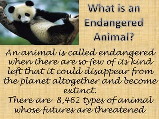 An animal is considered endangered when there are very few left such that it risks going extinct. There are currently over 8,000 endangered animal species worldwide. The main reasons animals become endangered include destruction of habitat by human development; pollution of oceans, air and water; overhunting for meat, fur and other products; and the introduction of exotic species that prey on or infect native species.