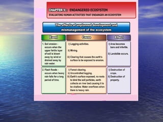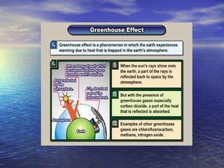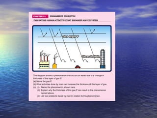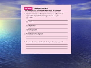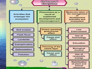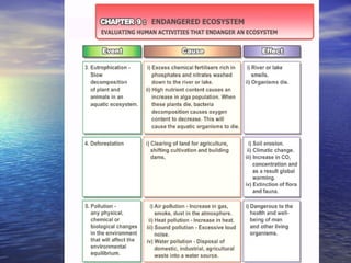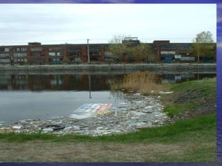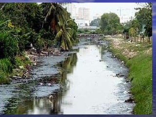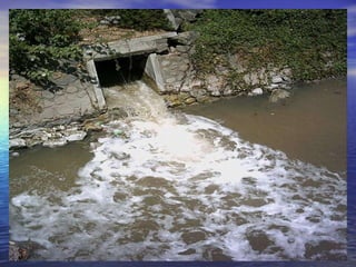 This document discusses different types of pollution including air and water pollution. It outlines various sources and effects of air pollution such as factories, vehicles, and agriculture emitting pollutants like sulfur dioxide, nitrogen oxides, and carbon monoxide which can harm human health. Air pollution can also damage buildings, agriculture, and impact weather. Water pollution sources include domestic, agricultural, and industrial waste which can introduce harmful bacteria and chemicals into water, killing aquatic plants and animals. Eutrophication from agricultural runoff increases algae and reduces oxygen levels impacting aquatic life. Proper management of development activities and ecosystem preservation are important to address pollution issues.