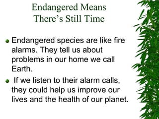 Endangered species act as fire alarms that tell us about problems with our environment. If we listen to their calls for help, we can improve our lives and planet's health. Endangered species indicate that our world may not be as healthy as we think and show the connections between all living things, including humans. Protecting endangered plants and animals under the Endangered Species Act helps preserve biodiversity for the future.