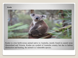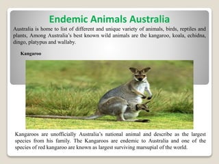 This document summarizes several endemic animal species found in Australia, India, Madagascar, and other regions. It describes kangaroos, koalas, echidnas, platypuses, and other iconic Australian animals. It also discusses endangered species in India like the Asiatic lion, sangai deer, and lion-tailed macaque. Several unique species found only in Madagascar are highlighted as well, such as the panther chameleon, satanic leaf-tailed gecko, tomato frogs, and Madagascar hissing cockroaches.