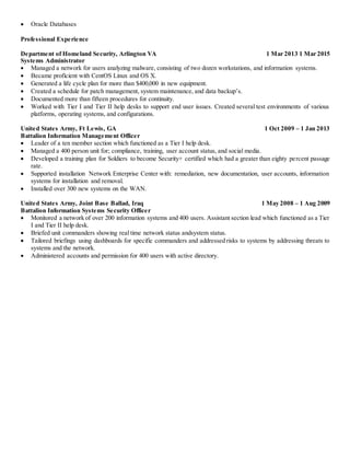Scott Bier is a mid-level system administrator currently located in Haymarket, VA who is immediately available. He has a Master's and Bachelor's degree in Cyber Security and certifications in Microsoft, CompTIA Security+, and Certified Ethical Hacker. Bier has over 10 years of experience as a system administrator for the Department of Homeland Security and United States Army, where he managed networks, systems, user accounts, and provided tier 1 and 2 support. He is proficient in Windows, Linux, networking, security software, and hardware and is currently learning Hyper-V, scripting, and Oracle databases.