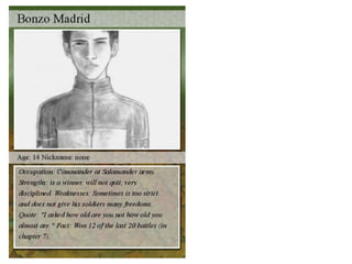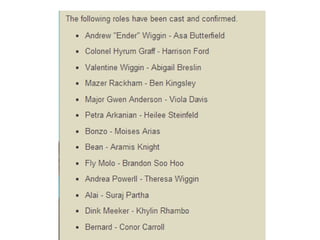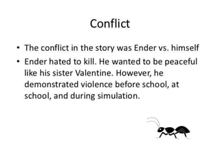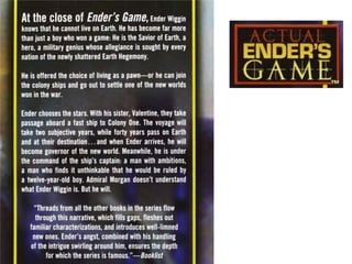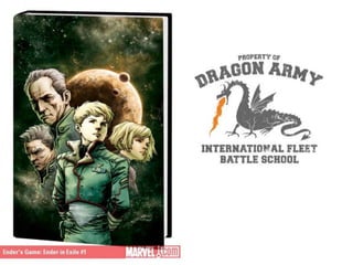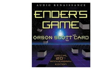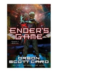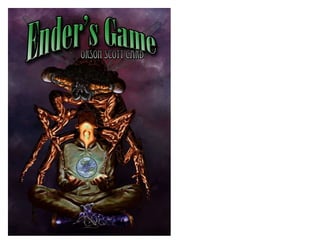 Ender's Game follows gifted child Andrew "Ender" Wiggin as he is recruited to Battle School, an orbital military academy in Earth's orbit, to train to defend humanity from an alien threat called the Formics. The novel describes Ender's experiences in Battle School, where he rises to command his own army through his tactical genius and ability to understand his opponents. It explores Ender as a uniquely gifted child struggling under the pressure of commanding Earth's forces in an intergalactic war where the fate of the human race hangs in the balance.