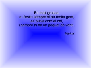 Es molt grossa,a l'estiu sempre hi ha molta gent, es blava com el cel, i sempre hi ha un poquet de vent. Marina