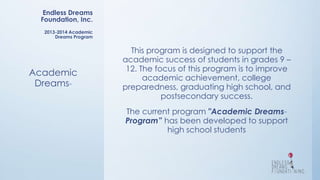 The document describes the Endless Dreams Foundation's Academic Dreams Program, which aims to support high school students' academic success, college preparedness, graduation from high school, and postsecondary outcomes. The program involves Saturday school activities focused on test prep, college preparation, goal setting, career preparation, and financial literacy to help ensure students complete high school and identify post-high school options. The program objectives are listed as promoting student success through these various academic and college preparatory activities. Contact information is provided for the CEO, program director, and foundation address.