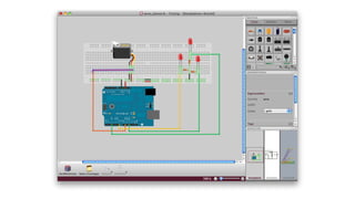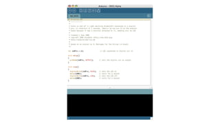 This document provides information about Arduino and how it can be used with the EventMachine library in Ruby. It discusses the Arduino hardware specifications including the microcontroller, memory, and input/output pins. It then covers the Arduino software and examples of basic sketches. The document explains how EventMachine allows Ruby programs to communicate with an Arduino by connecting to its serial port and receiving sensor data or sending commands. Code snippets are provided for setting up serial communication between an EventMachine Ruby app and an Arduino.