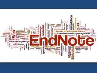 EndNote is a reference management software used to organize bibliographies and references when writing essays and articles. It was first created for Mac and is now in its 29th version. EndNote is developed by Thomson-Reuters Corporation, a multinational media and information firm headquartered in New York City. To use EndNote, you install the software, create an EndNote library to add and organize references, and insert citations automatically into a Microsoft Word document in the preferred style.