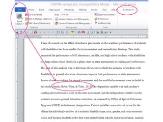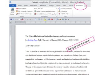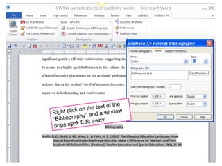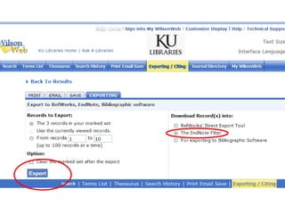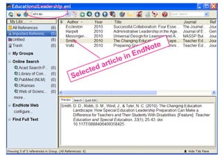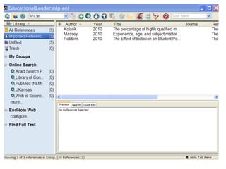 This document provides an overview of how to use EndNote in 90 minutes or less. It discusses using EndNote to organize citations from various sources and create bibliographies. It then demonstrates how to download and install EndNote, create an EndNote library, import references from database searches into an EndNote library, and insert citations into a Word document from EndNote. The document stresses that detailed guides are available online for importing references from specific databases into EndNote.