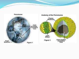 The endoplasmic reticulum is a network of membranes in eukaryotic cells that includes rough and smooth areas. Rough ER contains ribosomes and synthesizes proteins, while smooth ER synthesizes lipids and metabolizes drugs. The Golgi apparatus processes and packages proteins and lipids in vesicles for transport. Lysosomes contain enzymes for intracellular digestion, and peroxisomes contain enzymes for lipid metabolism and produce hydrogen peroxide as a byproduct.