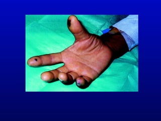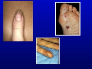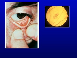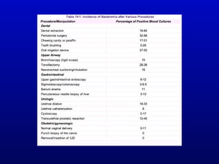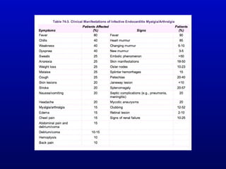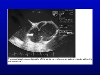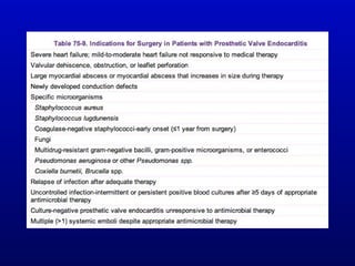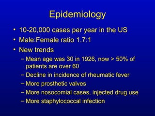 Infective endocarditis is an infection of the heart valves or endocardium. It occurs at a rate of 10,000-20,000 cases per year in the US. Staphylococcus aureus is the most common cause. Diagnosis is made using the Modified Duke Criteria which considers blood culture results, echocardiogram findings, and clinical features. Treatment involves prolonged antibiotic therapy for 4-6 weeks depending on the causative organism. Surgery may be required for complications or refractory infection. Prophylaxis with antibiotics is recommended for certain high risk dental and surgical procedures to prevent bacteremia and seeding of valves.