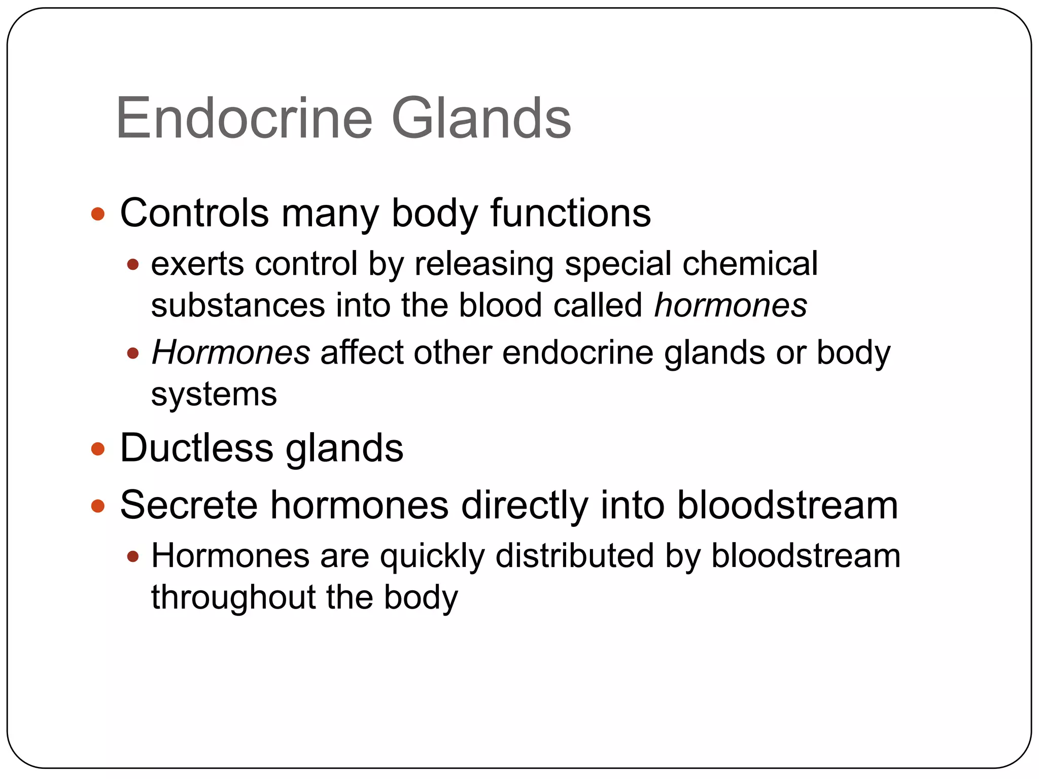 The endocrine system consists of glands that secrete hormones directly into the bloodstream to regulate distant target organs and tissues. The pituitary gland is called the "master gland" as it controls other endocrine glands by producing hormones that stimulate or inhibit their secretions. Disorders of the endocrine system can result from too little or too much hormone production and can have wide-ranging effects on the body if left untreated.