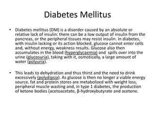This document summarizes information about endocrine disorders, with a focus on diabetes mellitus. It describes the different types of diabetes, including type 1, type 2, gestational diabetes, and maturity-onset diabetes of the young. The clinical features, acute and chronic complications, diagnosis, and management of diabetes are discussed in detail. Treatment involves lifestyle changes, oral medications, insulin administration, and glycemic control monitoring. Dental considerations for diabetic patients are also reviewed.