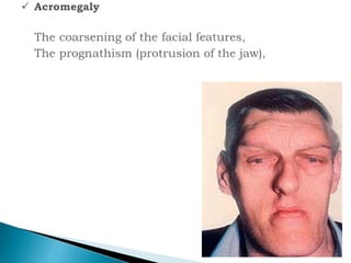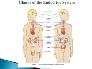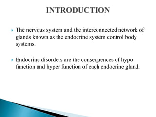 This document provides an overview of the endocrine system and pituitary gland. It discusses that the endocrine system and nervous system control body systems through hormone secretion. It describes the different types of hormones and how they are regulated. It focuses on disorders of the pituitary gland including hypopituitarism, Cushing's syndrome, acromegaly, gigantism, Sheehan's syndrome, and pituitary tumors. It also discusses diabetes insipidus and Syndrome of Inappropriate Antidiuretic Hormone. Nursing diagnoses and management are mentioned for various endocrine disorders.