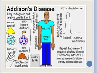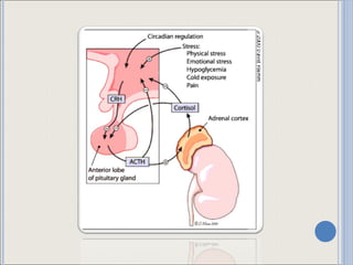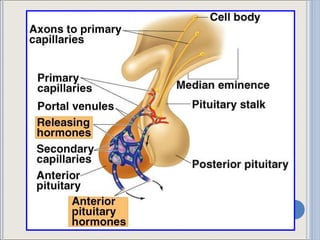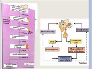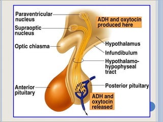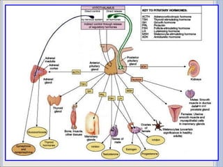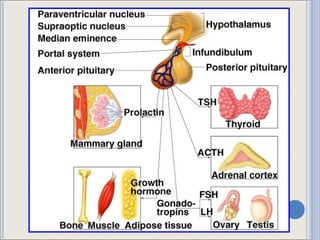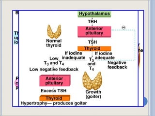 This document summarizes major endocrine disorders, focusing on disorders of the pituitary gland and thyroid gland. It describes the negative feedback mechanism of hormone regulation and classifies endocrine disorders as primary, secondary, or tertiary based on the site of dysfunction. Specific disorders discussed in detail include hyperpituitarism, hypopituitarism, diabetes insipidus, SIADH, hyperthyroidism, hypothyroidism, and myxedema coma. Treatment options for each condition are also outlined.