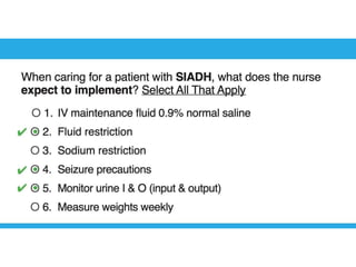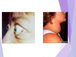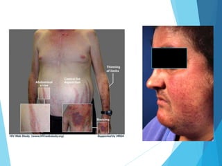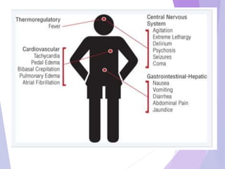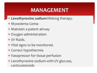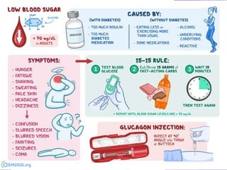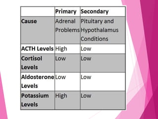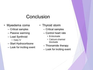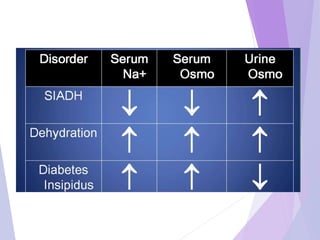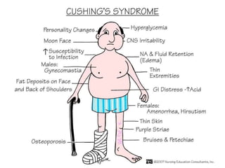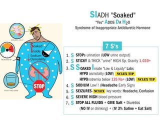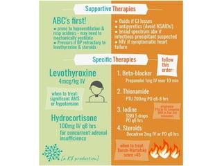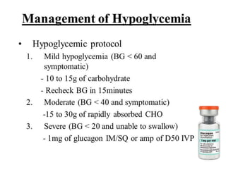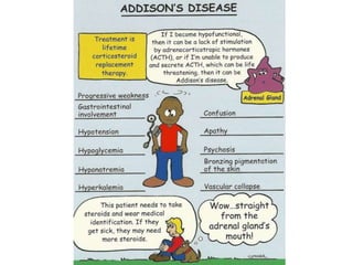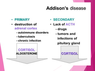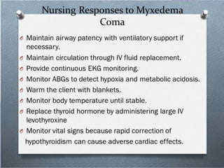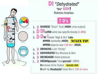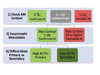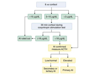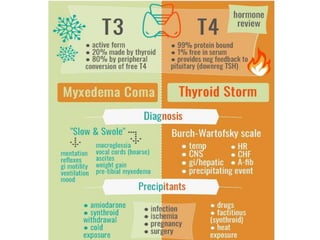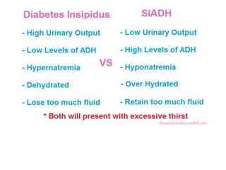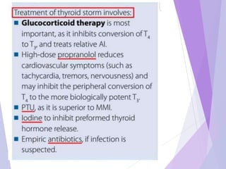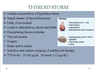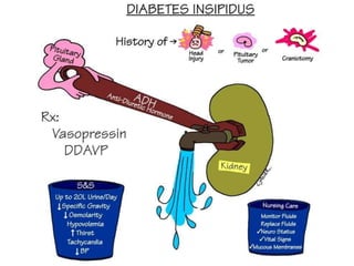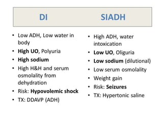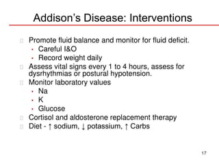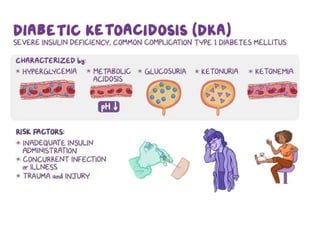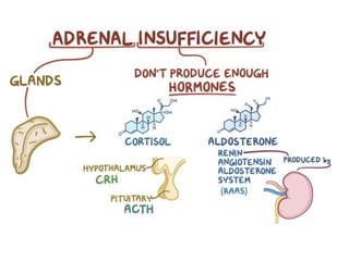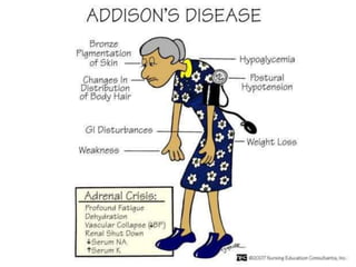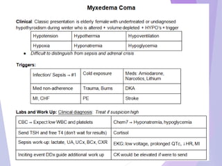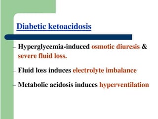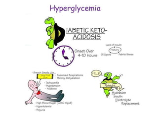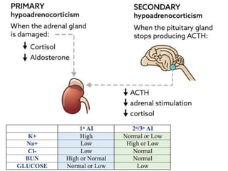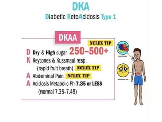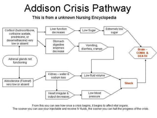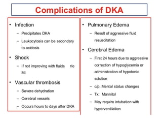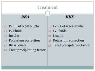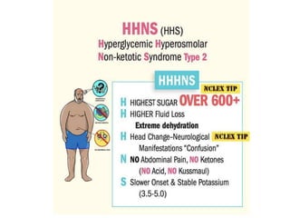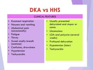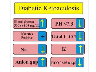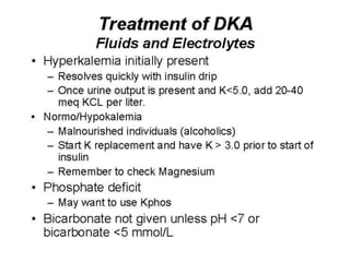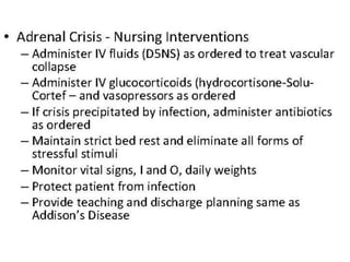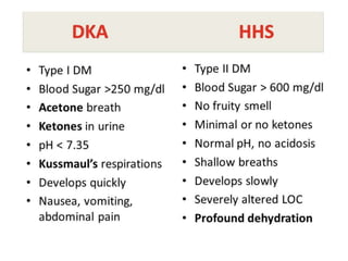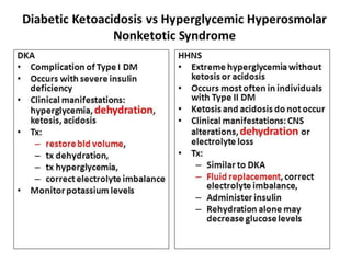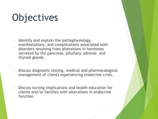 This document discusses endocrine emergencies including disorders of the pancreas, pituitary, adrenal and thyroid glands. It covers the pathophysiology, manifestations, and treatment of diabetic ketoacidosis (DKA) and hyperglycemic hyperosmolar state (HHS), as well as hypoglycemia, Addison's disease, and adrenal crisis. The key aspects of assessment and management are fluid resuscitation, electrolyte replacement, insulin therapy, and treatment of acidosis for DKA and HHS patients. Nursing diagnoses related to ineffective breathing, gas exchange, fluid deficits, and therapeutic management are also reviewed.