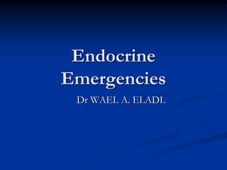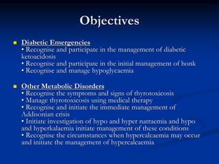 This document provides an overview of endocrine emergencies, including diabetic emergencies like diabetic ketoacidosis and hypoglycemia. It also covers other metabolic disorders such as thyrotoxicosis, Addisonian crisis, and electrolyte abnormalities. For each condition, it describes the symptoms, pathophysiology, diagnosis, and treatment approach. The goal is to help recognize and initiate management of these urgent endocrine conditions.