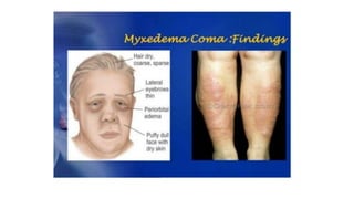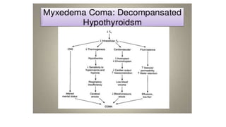 1. Myxedema coma is a life-threatening complication of severe untreated hypothyroidism, often precipitated by an acute illness. It involves altered mental status and multiple organ dysfunction.
