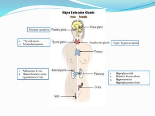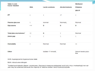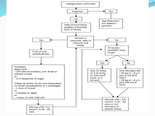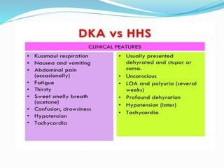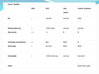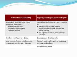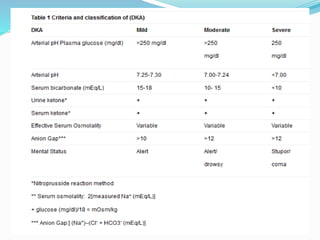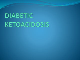 1. Diabetic ketoacidosis is characterized by hyperglycemia, ketosis and acidemia due to insulin deficiency. It requires fluid resuscitation and insulin therapy.