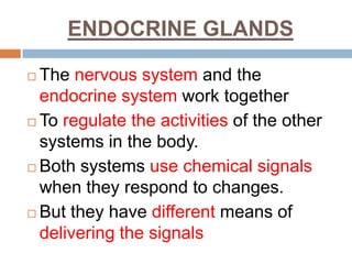 The endocrine system coordinates activities through chemical messengers called hormones. It consists of endocrine glands that secrete hormones directly into the bloodstream. The hypothalamus and pituitary gland regulate many other endocrine glands. The thyroid gland regulates metabolism through thyroxine and calcitonin regulates calcium levels. The parathyroid glands work with the thyroid to maintain calcium homeostasis through PTH. The adrenal glands produce hormones like adrenaline for the fight-or-flight response. The pancreas regulates blood sugar through insulin and glucagon. The gonads produce sex hormones like testosterone and estrogen.