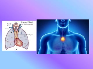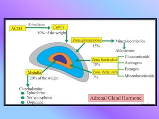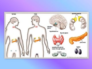 The document provides an overview of the endocrine system, detailing its ductless glands and hormones that regulate various body functions. It describes key glands including the pituitary, thyroid, parathyroid, adrenal, pancreas, sex glands, thymus, and pineal gland, along with their hormones and respective functions. Additionally, it outlines the disorders associated with these glands, such as hypothyroidism, hyperthyroidism, and adrenal diseases.