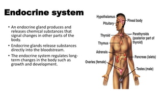 The endocrine system regulates long-term changes in the body through glands that release chemical substances called hormones directly into the bloodstream. Hormones control homeostasis, metabolism and growth, reproductive functions, water balance, heart rate and blood pressure, immune function, and more. Hormones are either steroid hormones that diffuse through cell membranes or nonsteroid hormones that bind to receptors on cell surfaces or inside cells. The endocrine glands include the thyroid, parathyroid, adrenal, pituitary, pancreas, ovaries, testes, and placenta.
