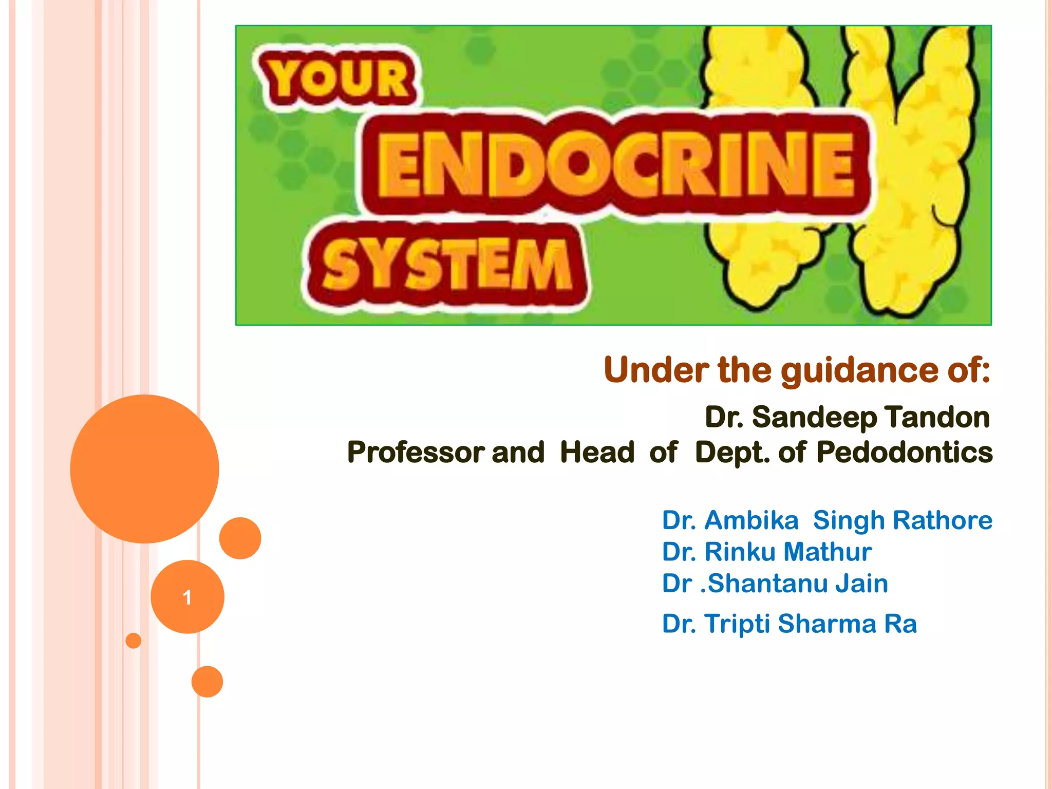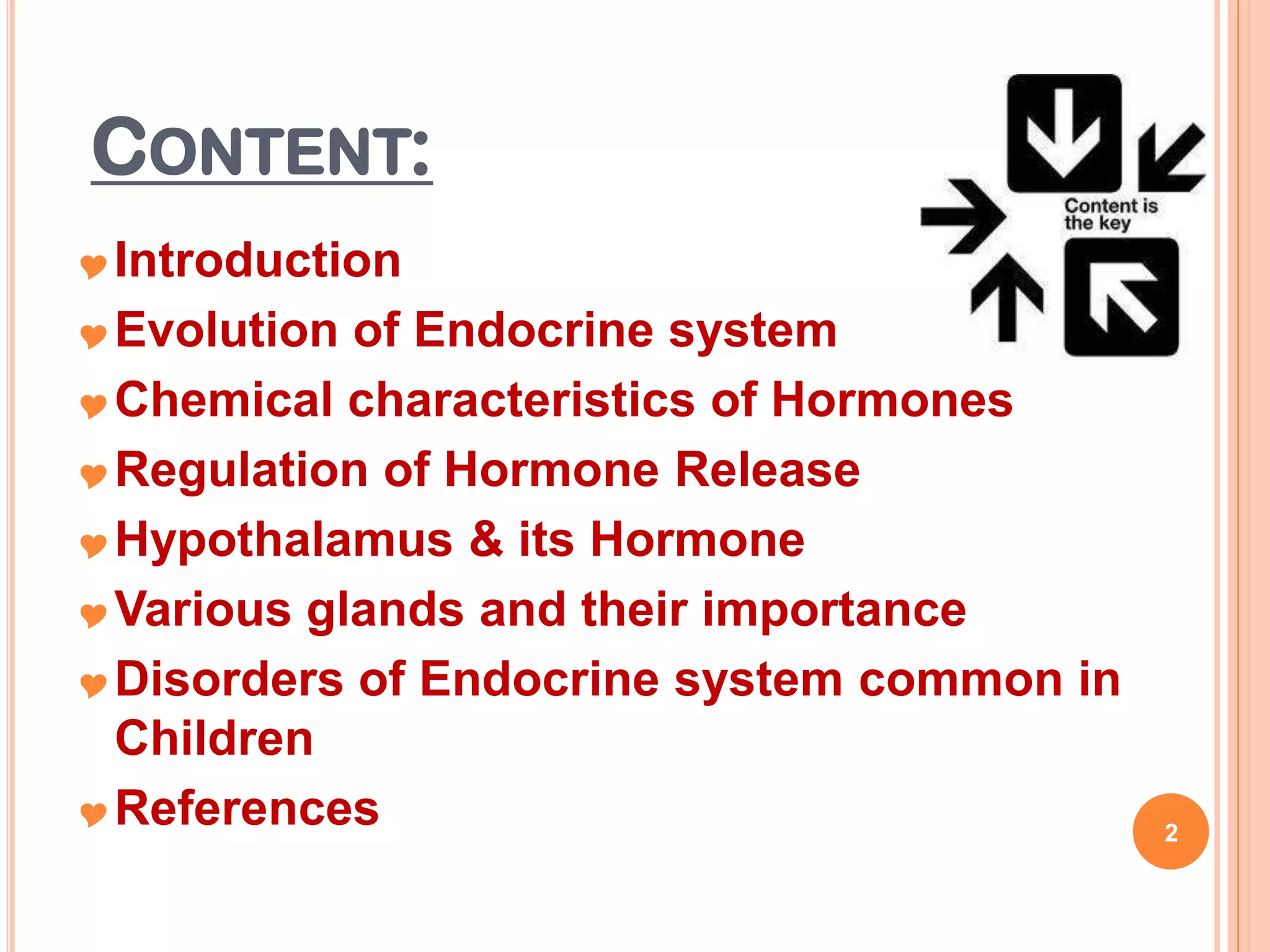 The document discusses the endocrine system, describing the major glands including the hypothalamus, pituitary gland, thyroid gland, parathyroid glands, adrenal glands, pancreas, and gonads. It explains the hormones produced by each gland and their roles in regulating processes like growth and development, metabolism, fluid balance, and reproduction. Common endocrine disorders in children like diabetes are also mentioned.