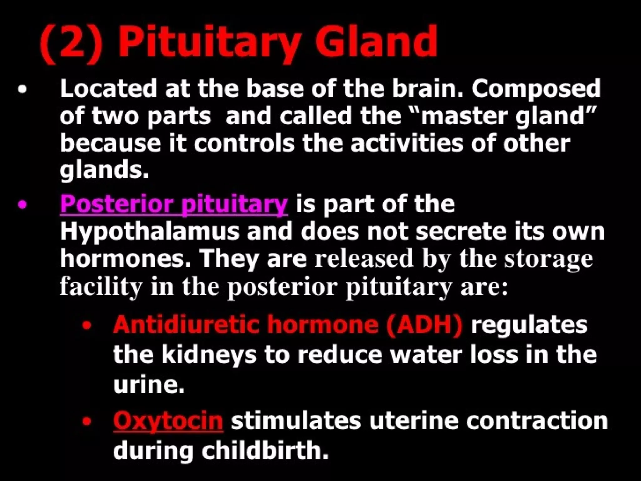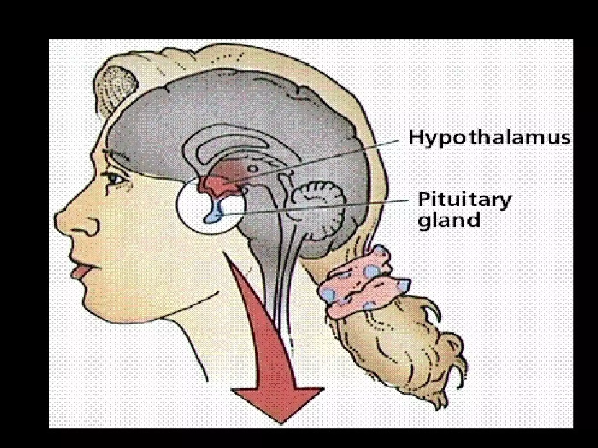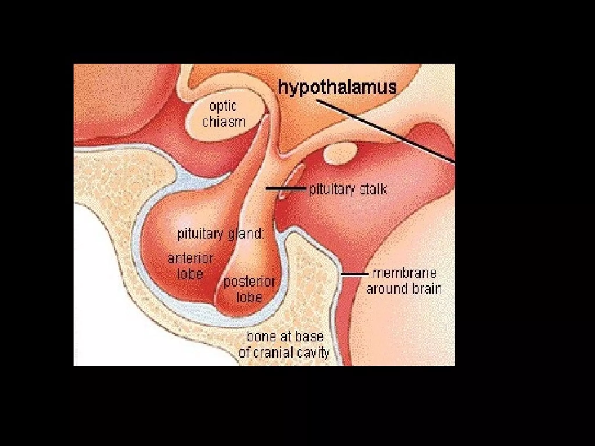 The pituitary gland secretes 8 hormones and is divided into two divisions - the anterior and posterior pituitary. The anterior pituitary secretes TSH, ACTH, FSH, LH, GH, and PRL. The posterior pituitary secretes ADH and oxytocin. Pathologies of the endocrine system are discussed including gigantism, acromegaly, and pituitary dwarfs from GH issues as well as diabetes insipidus from too much ADH. Diseases of the thyroid like Graves' disease and hypothyroidism are also covered. Cushing's syndrome and Addison's disease related to the adrenal glands are described. Feedback loops that regulate the endocrine system are discussed.