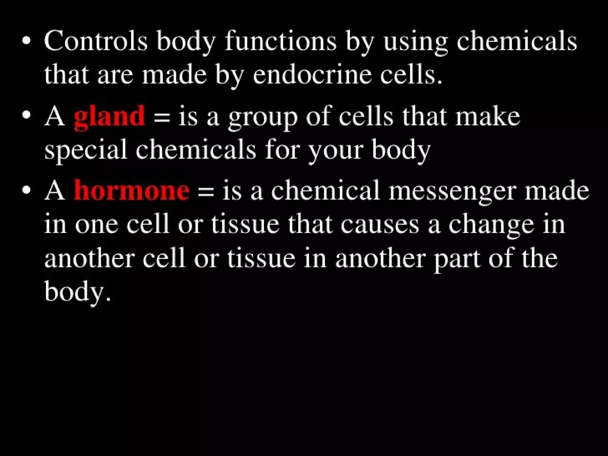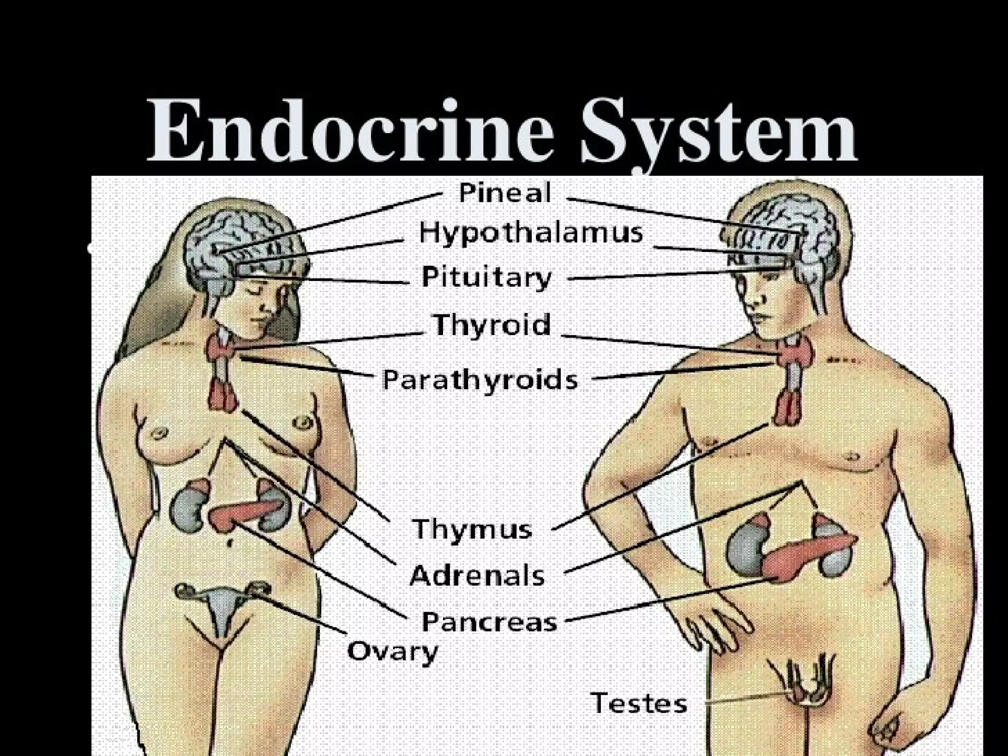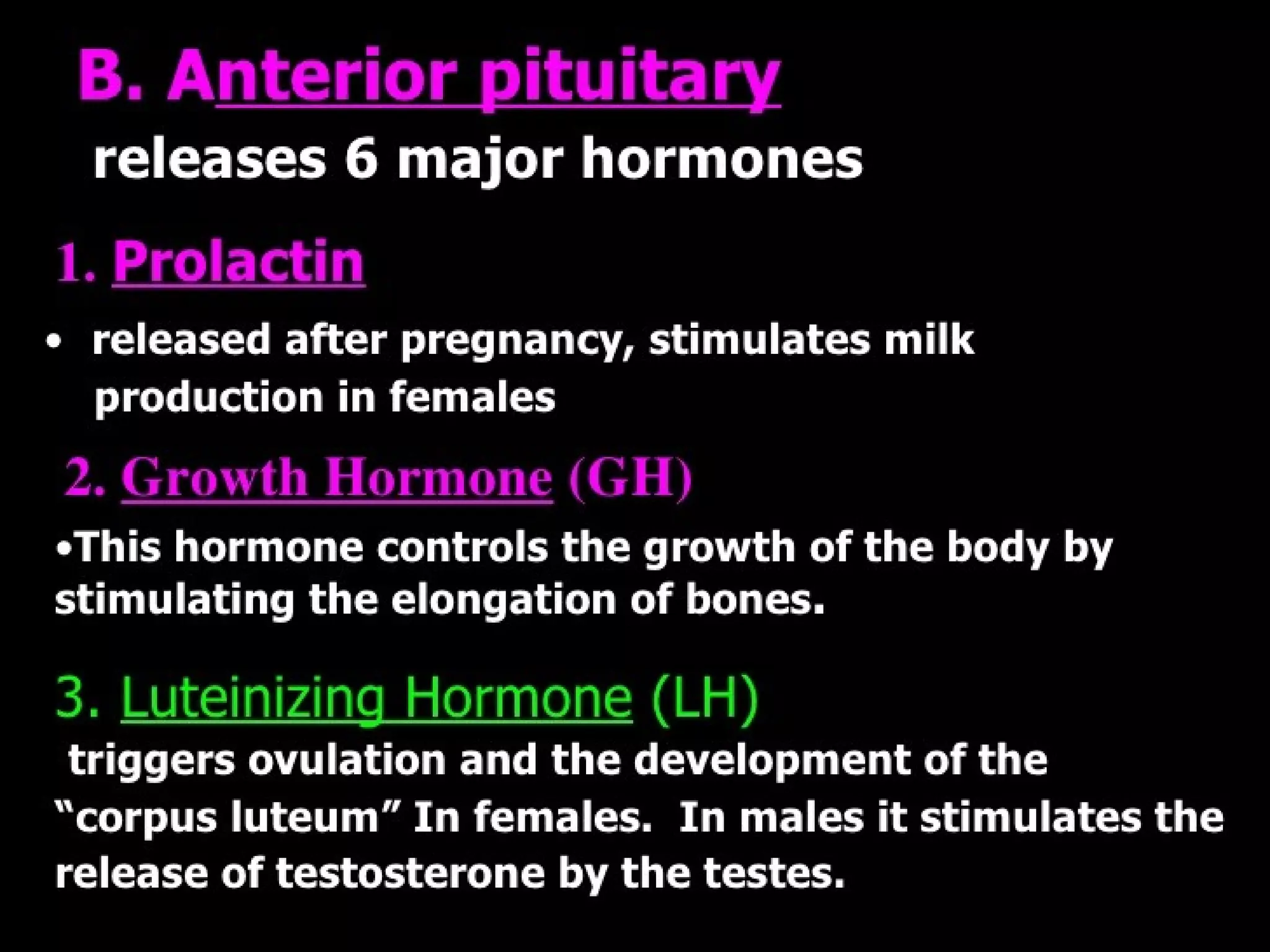 The pituitary gland secretes 8 hormones and is divided into two divisions - the anterior and posterior pituitary. The anterior pituitary secretes TSH, ACTH, FSH, LH, GH, and PRL. The posterior pituitary secretes ADH and oxytocin. Pathologies of the endocrine system are discussed including gigantism, acromegaly, and pituitary dwarfs from GH issues as well as diabetes insipidus from too much ADH. Diseases of the thyroid like Graves' disease and hypothyroidism are also covered. Cushing's syndrome and Addison's disease related to the adrenal glands are described. Feedback loops that regulate the endocrine system are discussed.