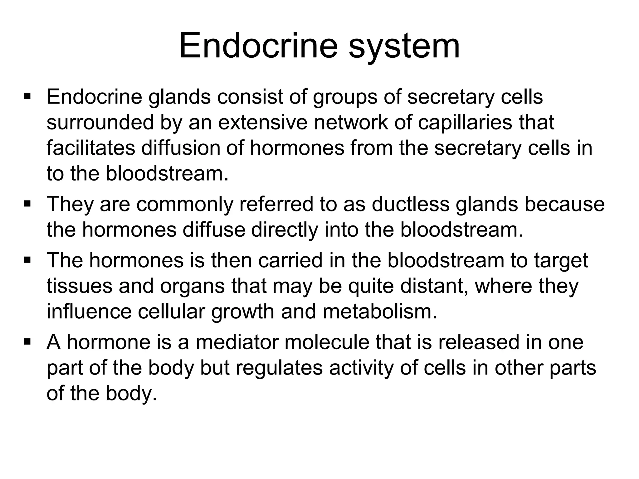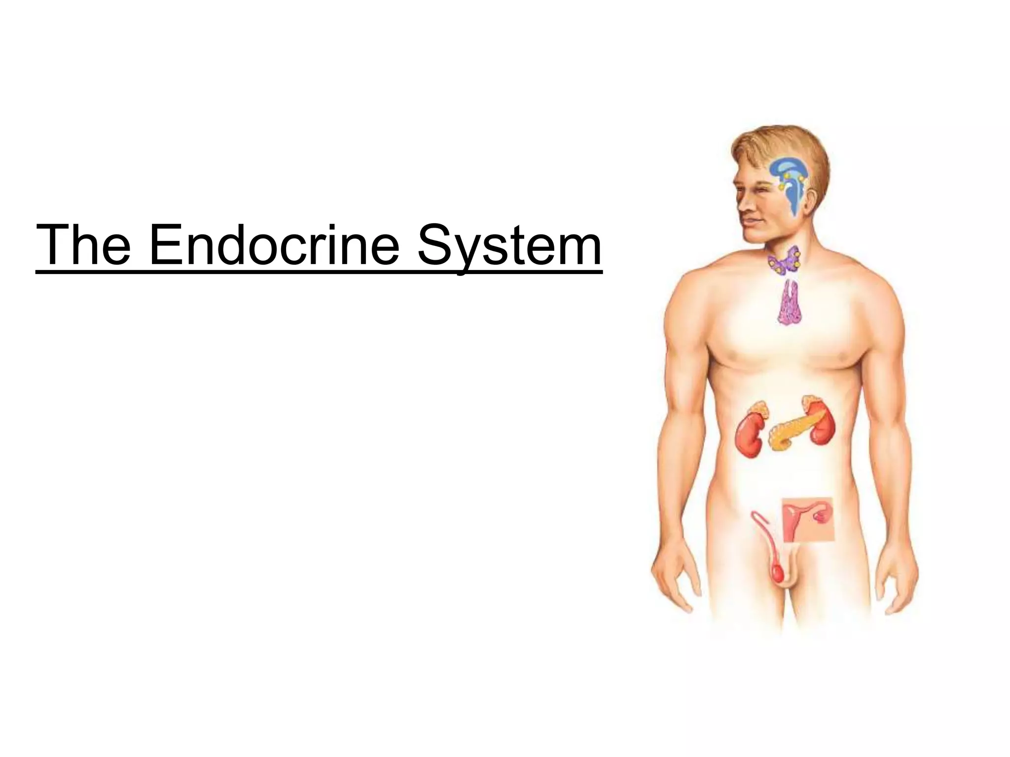 The endocrine system consists of glands that secrete hormones directly into the bloodstream to regulate distant tissues and organs. The major glands include the pituitary, thyroid, parathyroid, adrenal and pineal glands. The hypothalamus and tissues like the pancreas also secrete hormones. Hormones travel through the bloodstream and bind to target cells. The pituitary gland and hypothalamus regulate other endocrine glands through feedback mechanisms. The endocrine system maintains homeostasis through processes like glucose regulation and calcium balance.