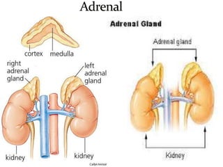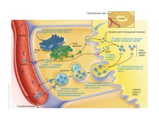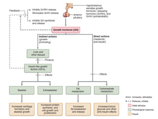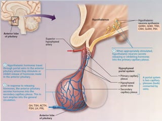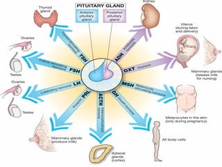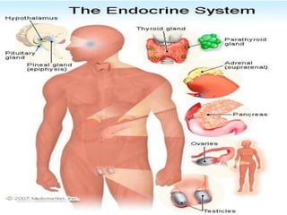 The document summarizes key aspects of the endocrine system. It describes how hormones are chemical messengers that influence metabolic activity by binding to receptors and initiating responses. The major endocrine glands - pituitary, thyroid, parathyroid, thymus, pancreas, adrenal glands, testes, and ovaries - are described along with their locations, secretions, and functions in processes like reproduction, growth, metabolism regulation, and stress response. The hypothalamus links the nervous system to the endocrine system by secreting hormones that stimulate or inhibit pituitary secretions.