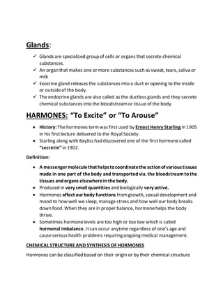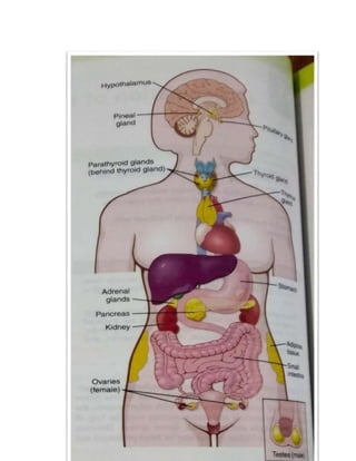 The document discusses the human endocrine system. It provides definitions of hormones and describes the major endocrine glands and their roles. The endocrine glands include the hypothalamus, pituitary gland, thyroid gland, parathyroid gland, adrenal glands, pancreas, ovaries, and testes. The hypothalamus and pituitary gland control the other endocrine glands by producing releasing and inhibiting hormones. The endocrine glands secrete hormones like insulin, estrogen and testosterone to regulate processes throughout the body, including growth and development, metabolism, and reproduction.