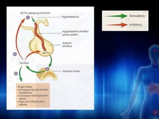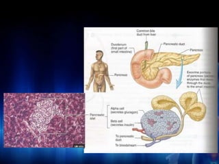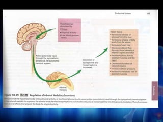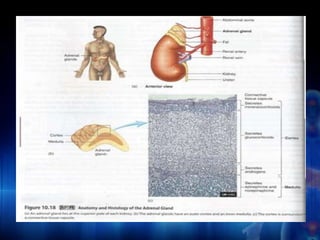 The document describes several endocrine glands and their roles in regulating various bodily processes. It discusses the adrenal glands which secrete hormones like epinephrine, cortisol, and aldosterone to regulate metabolism, immune function, and electrolyte balance. The pancreas produces insulin and glucagon to maintain blood glucose levels. The gonads and pituitary gland regulate the reproductive system through sex hormones and LH/FSH. The pineal gland secretes melatonin to influence circadian rhythms and reproduction.