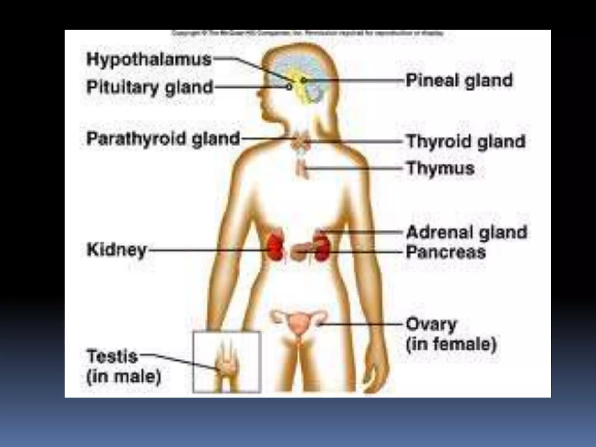 The endocrine system consists of glands that secrete hormones directly into the bloodstream to regulate various bodily functions such as growth, metabolism, reproduction, and the stress response. The major endocrine glands include the pituitary, thyroid, parathyroids, adrenals, pancreas, and gonads. The endocrine system works through chemical messengers called hormones to help maintain homeostasis, support growth and development, and coordinate cellular and organ functions throughout the body.