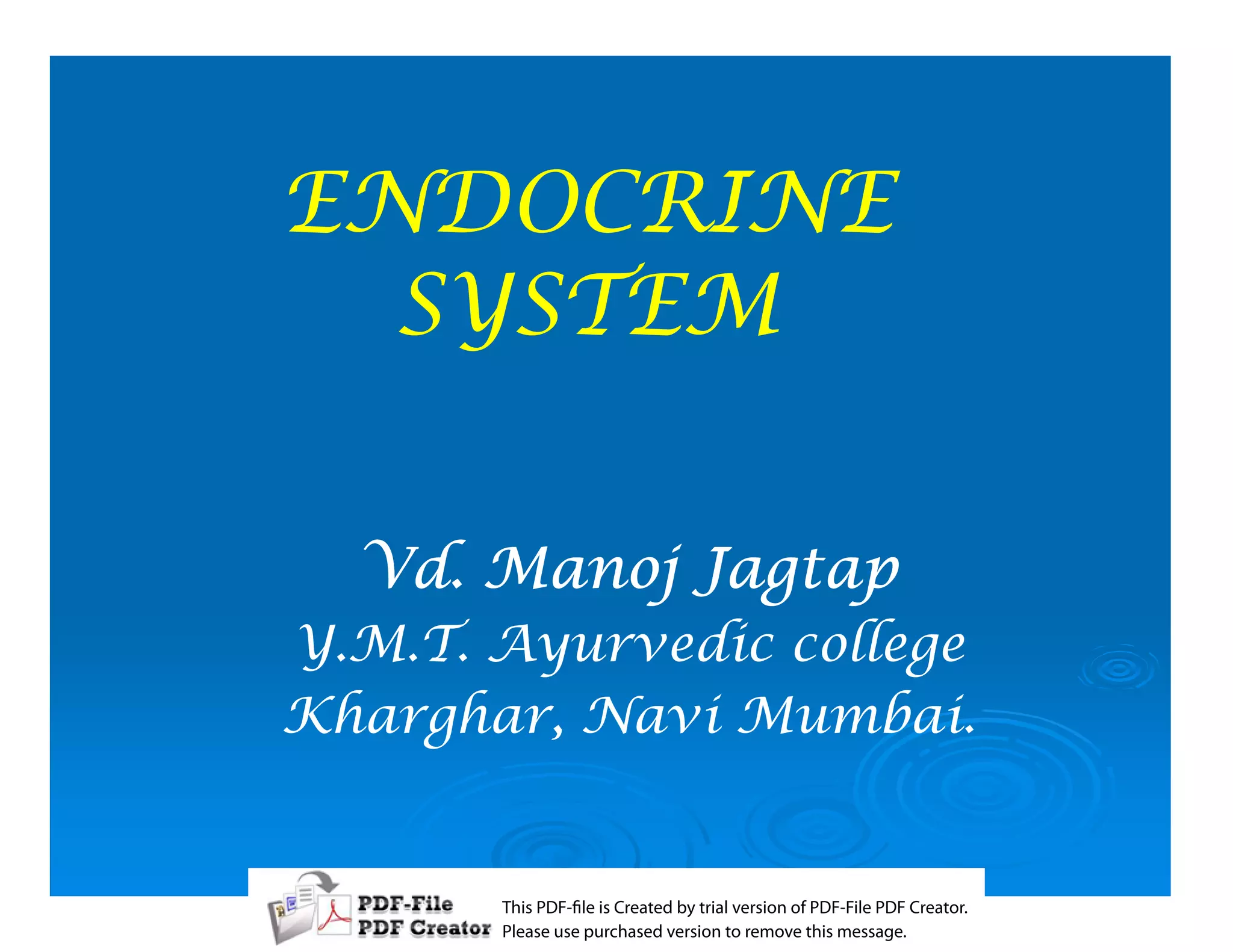 The document summarizes key aspects of the endocrine system and pituitary gland. It discusses that the endocrine system maintains homeostasis through hormones secreted into the bloodstream. The pituitary gland, located below the brain, has an anterior and posterior lobe. The anterior lobe contains cells that secrete hormones in response to signals from the hypothalamus to regulate other endocrine glands. The pituitary plays a central role in hormonal regulation through feedback loops.