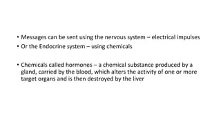 The endocrine system communicates messages via hormones released directly into the bloodstream from ductless glands. Hormones are carried throughout the body and affect target organs. Important endocrine glands include the adrenal glands, which secrete adrenaline in response to stress signals from the brain, causing effects like increased heart rate and breathing. Plants also respond to stimuli through hormones like auxin, which is produced in shoot tips and causes phototropism by stimulating faster growth on the shady side of shoots, bending them towards light sources.