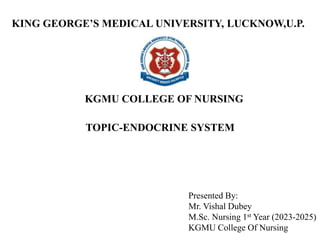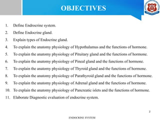 This document discusses the endocrine system, outlining its definition, major glands, and the physiology of each gland including the hypothalamus, pituitary, thyroid, and adrenal glands, among others. It details the hormones secreted by these glands and their functions, such as growth regulation and metabolic control. Additionally, it describes methods used for diagnostic evaluation of hormonal levels and functions, emphasizing the importance of maintaining hormonal health.