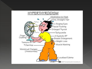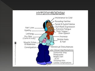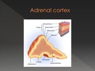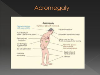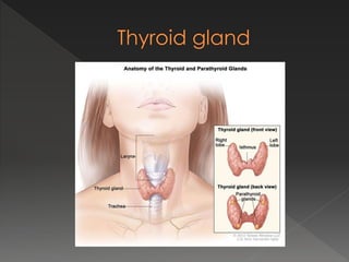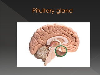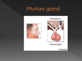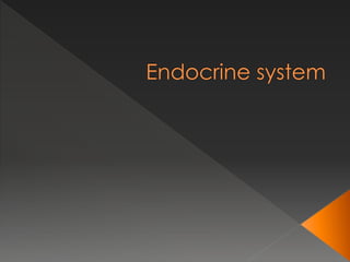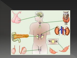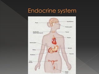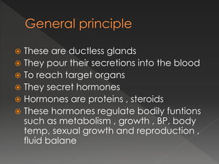 This document discusses the endocrine system, including that endocrine glands secrete hormones directly into the bloodstream which then travel to target organs to regulate various bodily functions such as metabolism, growth, blood pressure, and reproduction. It lists several important hormones including growth hormone, thyroid hormones, adrenal hormones, sex hormones, insulin, glucagon, and others that work to control functions throughout the body.