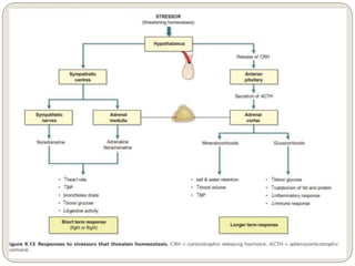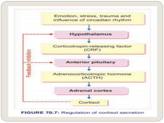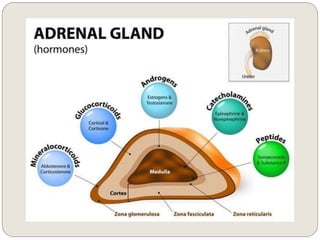 The endocrine system consists of glands that secrete hormones directly into the bloodstream to regulate distant target organs and tissues. The major glands include the pituitary, thyroid, parathyroid, adrenal, pancreas, ovaries, and testes. The pituitary gland is considered the "master gland" as it controls other endocrine glands by producing hormones that stimulate or inhibit their secretions. Hormones travel through the bloodstream to target cells, regulating critical functions like growth, metabolism, mood, fertility, and fluid and mineral balance. Negative feedback loops help maintain optimal hormone levels within a narrow range.
