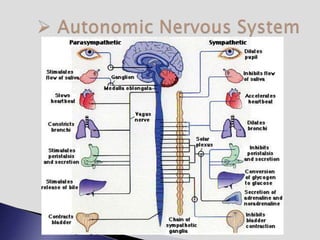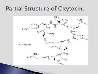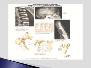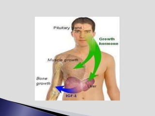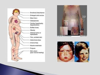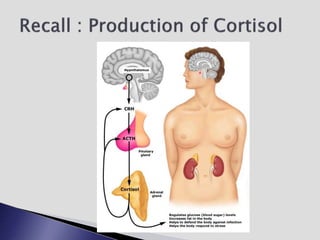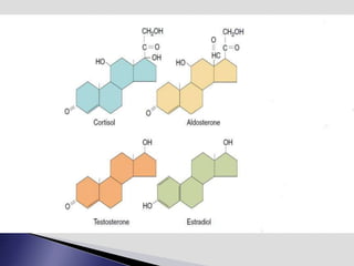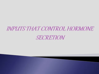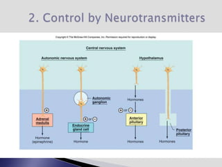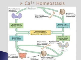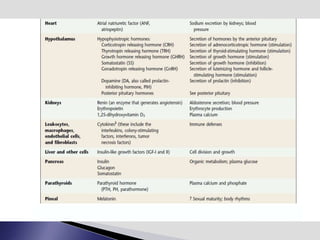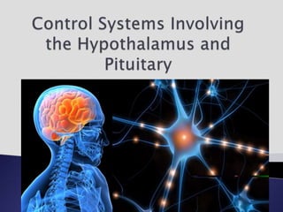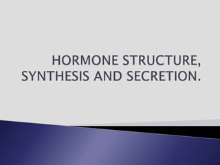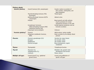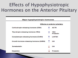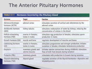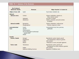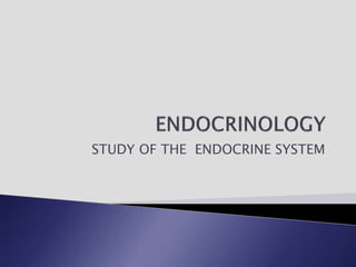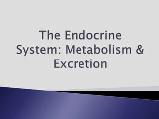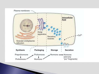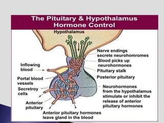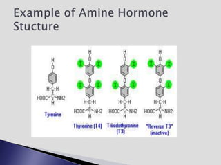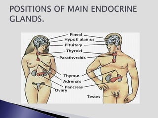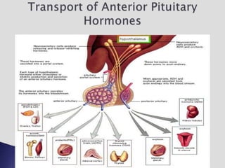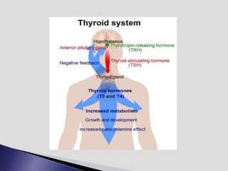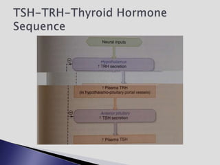 The endocrine system involves communication between glands and target cells through chemical messengers called hormones. The pituitary gland located at the base of the brain regulates other endocrine glands through feedback loops. It has an anterior and posterior lobe. The thyroid gland produces the hormones thyroxine (T4) and triiodothyronine (T3) which affect metabolism. Thyroxine is converted to the active T3 in target cells. The thyroid synthesizes these hormones by binding iodine to tyrosine residues on thyroglobulin within its follicles.
