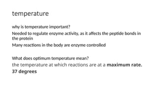 The document discusses the effects of temperature on ectotherms and endotherms, emphasizing the importance of temperature regulation for enzyme activity and metabolic processes. It outlines how endotherms actively regulate their body temperature through physiological mechanisms, while ectotherms rely on behavioral adaptations to manage their temperature. Key thermoregulatory responses such as vasodilation, sweating, shivering, and metabolic rate adjustments are explained in relation to each group's survival strategies in varying environments.