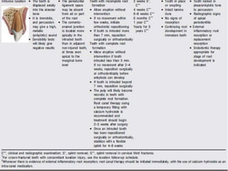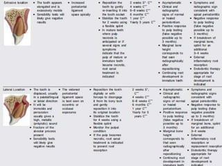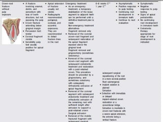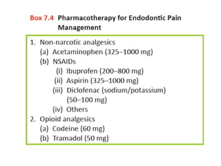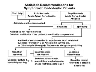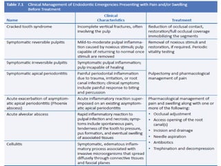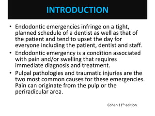An endodontic emergency is defined as pain and/or swelling caused by inflammation or infection of the pulp and/or periradicular tissues requiring immediate treatment. Common causes are pulpal pathologies and traumatic injuries. Pain results from chemical mediators and increased fluid pressure causing stimulation of pain receptors. Accurate diagnosis involves dental history, clinical examination including vitality testing and radiographs to determine the source and rapidly provide effective treatment.