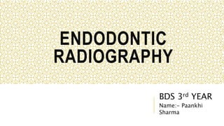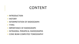 This document discusses endodontic radiography and the importance of radiographs in endodontic diagnosis and treatment. It provides a brief history of radiography and describes common types of radiographs used in endodontics like intraoral periapical radiographs and cone beam computed tomography (CBCT). Intraoral periapical radiographs allow visualization of the root structure and surrounding bone. CBCT provides high quality 3D images with less radiation compared to traditional CT. The document emphasizes that radiographs are essential for endodontic diagnosis, treatment planning, working length determination, and follow-up care.