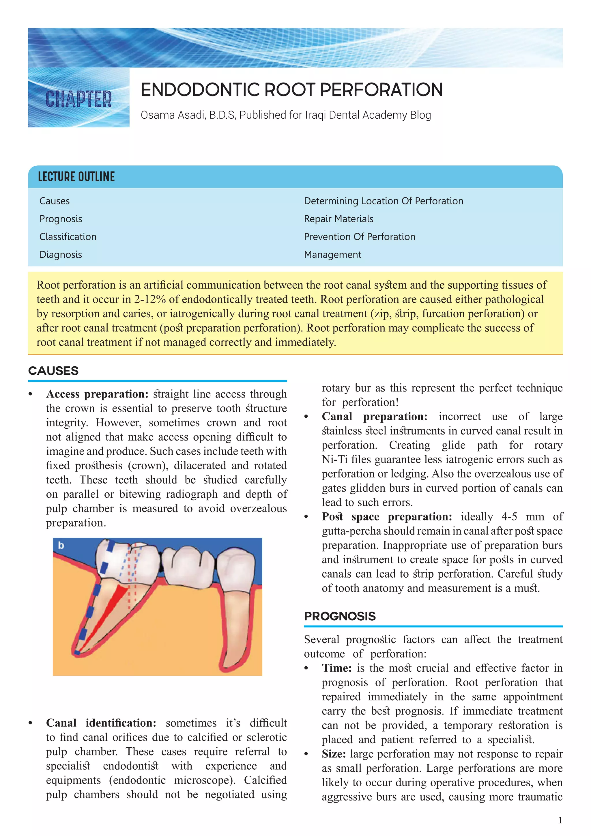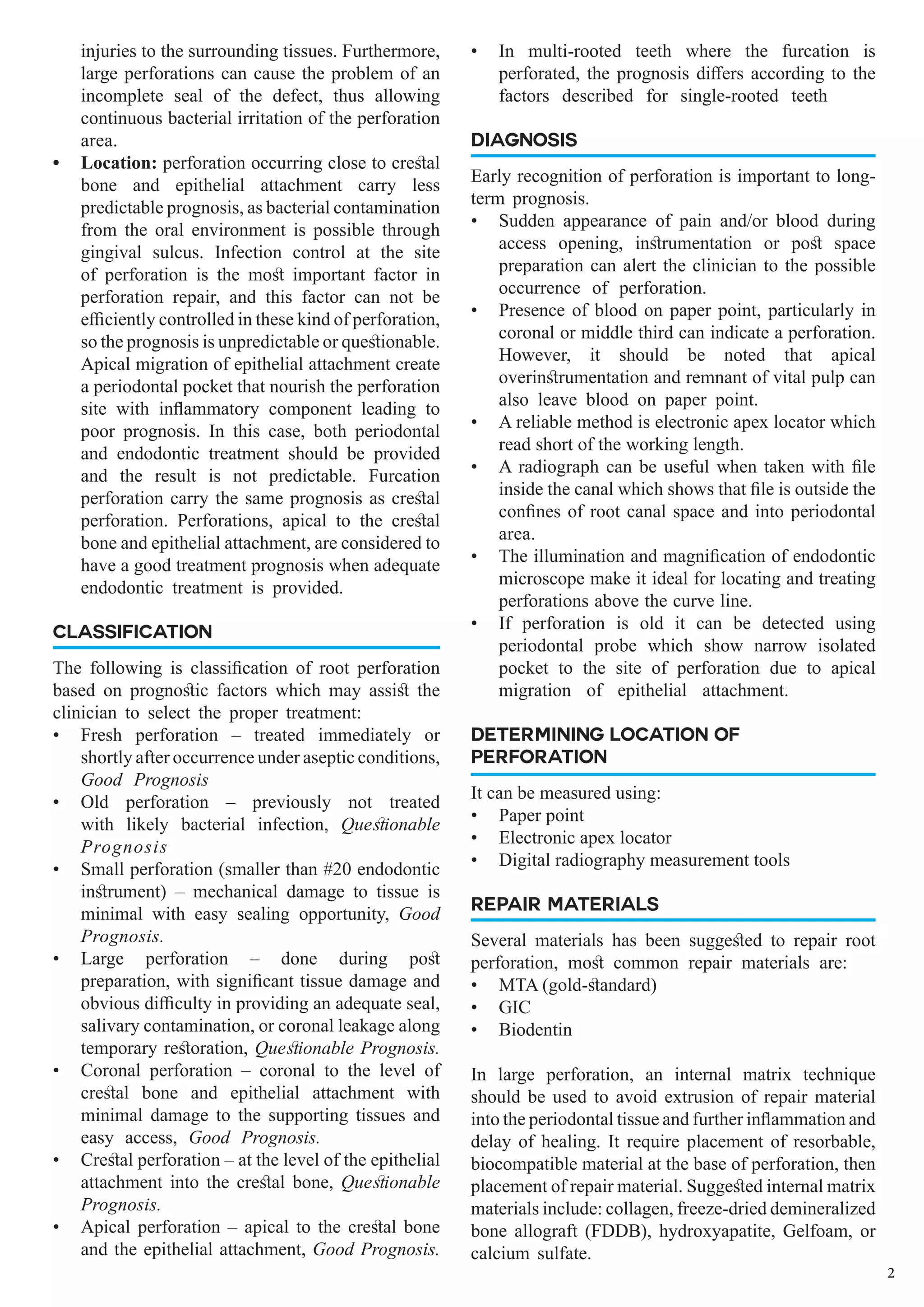 The document provides an overview of root perforation in endodontic treatment, including its causes, diagnosis, prognostic factors, management, and prevention strategies. It emphasizes the importance of immediate treatment for perforations, as delays can lead to poor prognosis, and discusses various repair materials and techniques based on the location and size of the perforation. The document also outlines the classifications of perforations and related treatment approaches, highlighting the need for careful evaluation during dental procedures to prevent such complications.