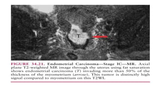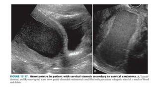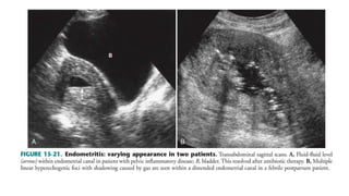 The document discusses various endometrial abnormalities that can be seen on ultrasound imaging. It begins by describing the normal endometrium and its cyclic changes. It then discusses endometrial hyperplasia, atrophy, polyps, and carcinoma. It provides ultrasound imaging features of each condition. The document also reviews endometritis, adhesions, and intrauterine devices. In summary, it serves as a guide for radiologists to understand and identify different endometrial pathologies using ultrasound.