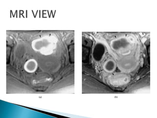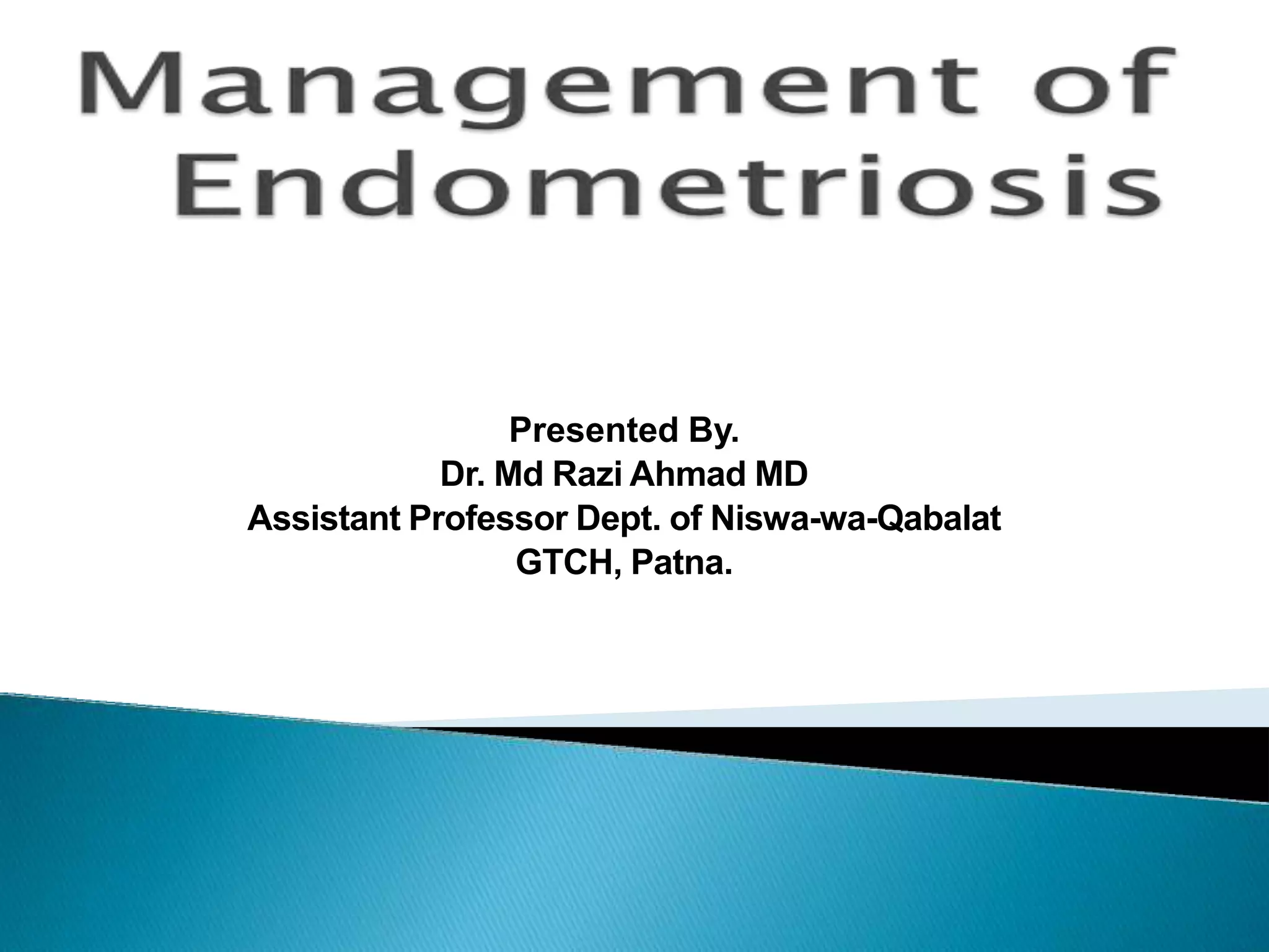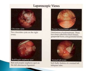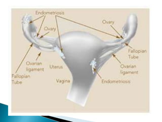 Endometriosis is the presence of endometrial tissue outside the uterus that induces a chronic inflammatory reaction. There are several proposed theories for its pathogenesis, including retrograde menstruation, coelomic metaplasia, and metastasis. Symptoms include pelvic pain and infertility. Diagnosis is typically made by laparoscopy to visualize lesions. Treatment involves pain management, preservation of fertility, and involves medical therapy with hormones or NSAIDs and surgery. The goal of management is individualized based on the patient's symptoms, disease severity, and fertility desires.