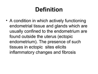 This document provides information on endometriosis including its definition, incidence, pathophysiology, risk factors, symptoms, diagnosis, and treatment options. Some key points: