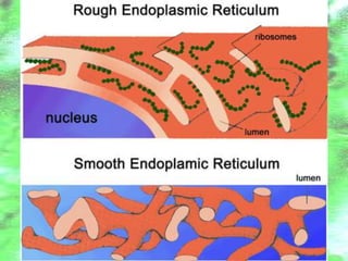 The document discusses the endoplasmic reticulum (ER), which is a network of membranous tubules and sacs that transports materials within cells. There are two types of ER - rough ER and smooth ER. Rough ER is prominent in cells that produce large amounts of proteins and has ribosomes attached. Smooth ER is involved in lipid and steroid synthesis and does not have ribosomes. The ER helps transport molecules within cells, provides structure, and is involved in processes like protein transport and modification, lipid and steroid synthesis, and breaking down toxic substances.